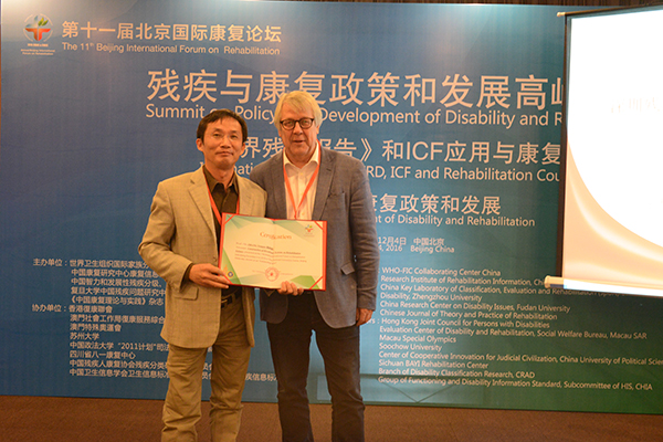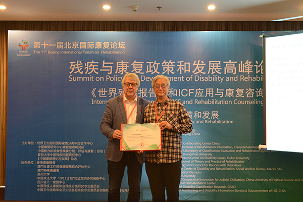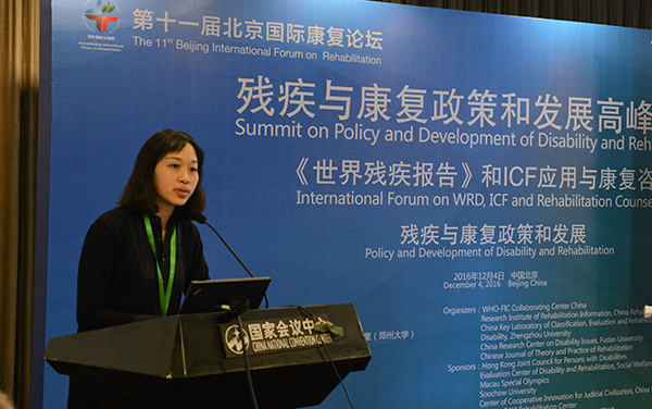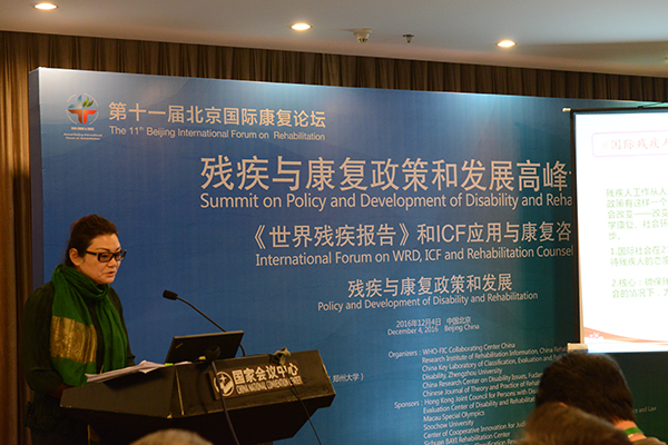 第十一届北京国际康复论坛残疾和康复政策与发展高峰论坛于2016年12月4日在北京国家会议中心举行。本次高峰论坛的主办方为中国康复研究中心康复信息研究所/世界卫生组织国际分类家族中国合作中心、中国智力和发展性残疾分级、评估与康复(运动)重点实验室、复旦大学中国残疾问题研究中心和《中国康复理论与实践》杂志,协办单位包括:香港复康联会、澳门社会工作局复康服务综合评估中心、澳门特殊奥运会、苏州大学、中国政法大学“2011计划"司法文明协同创新中心、四川省八一康复中心、中国残疾人康复协会残疾分类研究专业委员会、中国卫生信息学会卫生信息标准化专业委员会功能和残疾信息标准学组。来自国内外残疾和康复机构的100余位专家、学者和残疾康复管理工作者和其它相关人员应邀参加了此次峰会,包括受邀国际和国内知名专家32名,其中有国外专家1名,港澳专家6名?;褂欣醋允澜缥郎橹献髦行暮涂蹈垂实鹊拇?。