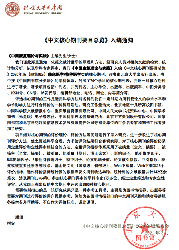 《中国康复理论与实践》再次入编2020版北大核心期刊