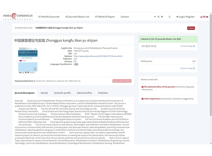 喜报!《中国康复理论与实践》被哥白尼索引期刊数据库(ICI World of Journals)收录