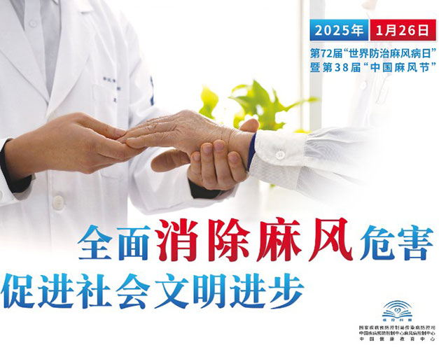 2025年1月26日是第72届“世界防治麻风病日”暨第38届“中国麻风节”。我国宣传活动的主题为“全面消除麻风危害,促进社会文明进步”,旨在坚持党的领导、部门协作、社会动员、全民参与的综合防控机制,全面实施消除麻风危害可持续发展规划,持续提升公众健康意识和素养,全力实现我国全面消除麻风危害的目标,共同促进社会文明进步。